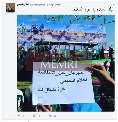 ...On April 28, 2016, she tweeted a photo evidently sent to her from Gaza, showing a model of a bombed-out Israeli bus on display against the backdrop of a mural of Jerusalem, featuring Al-Aqsa. In the photo someone holds up a sign with a message addressed to her, saying: "Ahlam Al-Tamimi, Gaza misses you." In the tweet she responds to the message, saying "Peace be upon you, Oh Gaza [city of] peace."
