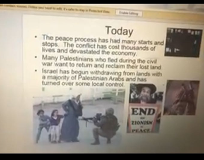 In 2014, Charles Jacobs listed some more outrageous examples of anti-Israel inculcation in US public schools: