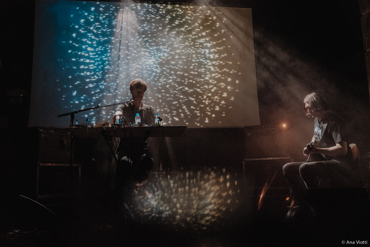 De seguida vieram “All Night Long” e “Lord I Don’t Know My Name”, dois grandes originais de Spectrum que encaixaram perfeitamente nesta viagem pelas estrelas e tudo mais além. Por esta altura já eram de notar os dotes guitarristicos de Jason Holt, e o quão bem encaixavam nesta sonoridade espiritual. Embora estes solos não se tenham desviado muito das músicas originais, Jason fez aqui um trabalho notável às rendições de Spectrum e Spacemen 3. “Let Me Down Gently”, “Call The Doctor” e a cover dos Suicide “Chè” vieram a seguir, e os nossos olhos continuavam fechados a contemplar o espaço para além das estrelas, e tudo dentro da nossa cabeça. Quando os olhos decidiam abrir por si só, deparávamos com dois astronautas psicadélicos em palco com uns visuais incríveis na tela atrás deles. Esses visuais iam acompanhando gentilmente a música de Pete Kember, em toda esta viagem pelos astros que eles nos iam proporcionando no Musicbox.